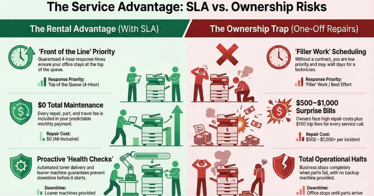 Ownership means calling a repair shop and hoping they have an opening. Rental with a Service Level Agreement (SLA) is the only way to guarantee uptime.